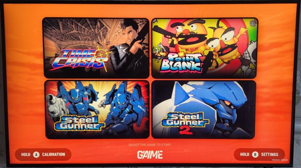 It’s interesting to note that none of the publicity material, or the Kickstarter, explicitly states that the games run from a console unit. It runs the preinstalled Time Crisis, Point Blank, Steel Gunner, andSteel Gunner 2, but very little is known about it. We do know a bit about the guns, though. They’re blue and orange on the EU/UK Kickstarter editions (black on the Japanese release) and feature a half-inch camera, rumble solenoid, and there’s also a useful reset button, which may or may not help you out when it comes to calibration.