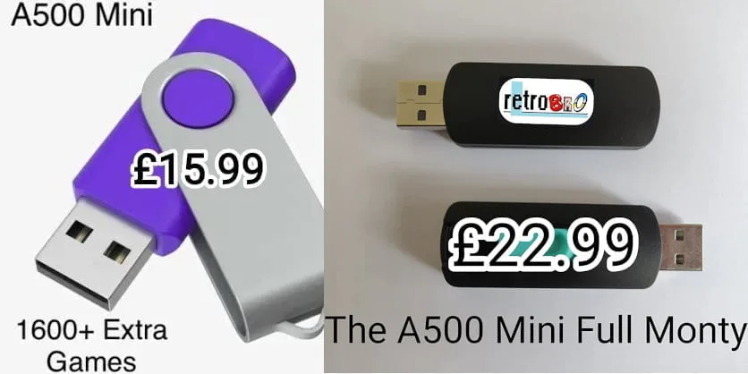In the space of just a few minutes, I’ve found two USB sticks for the A500 Mini. The first, USB Stick – 1600 Extra Games for the A500 Mini Console, costs £15.99, and has the following description: